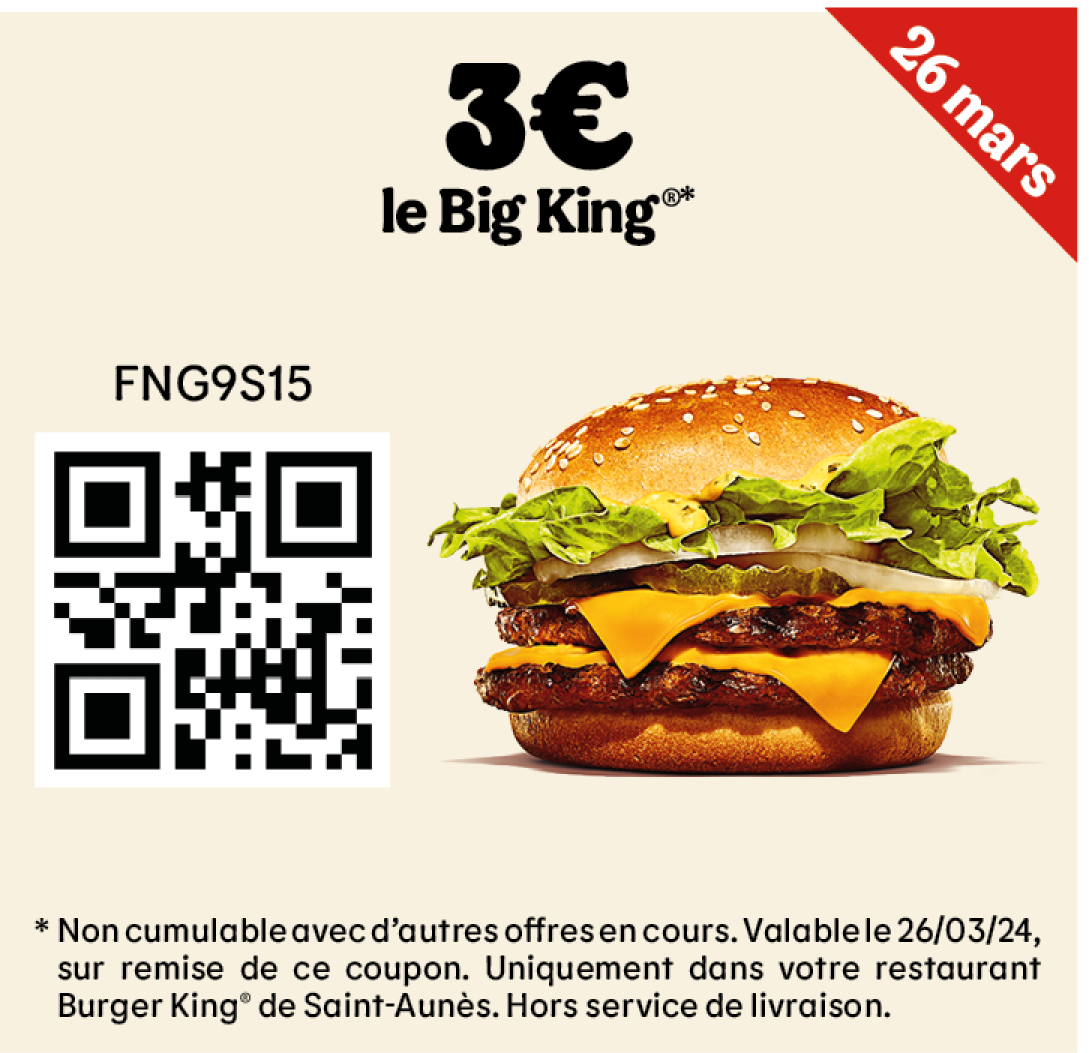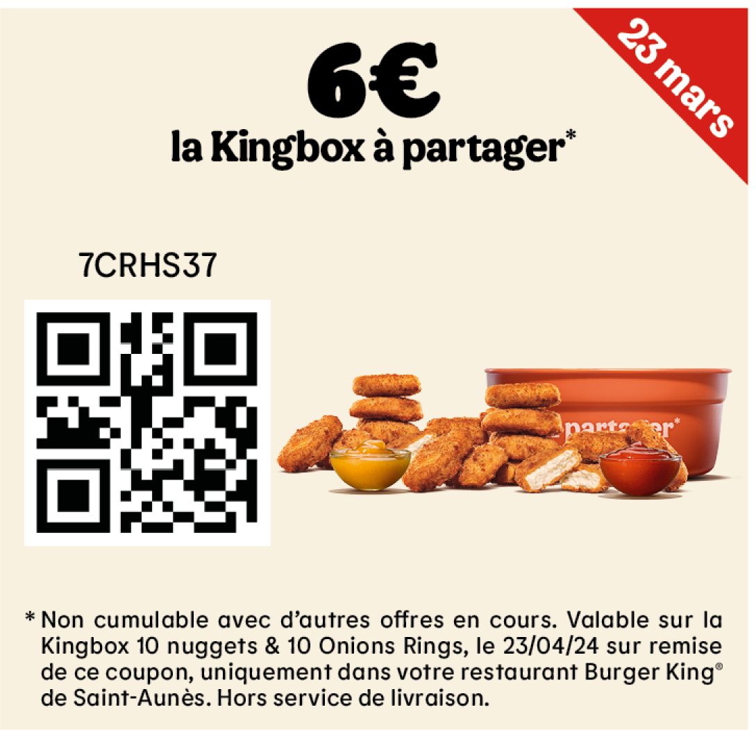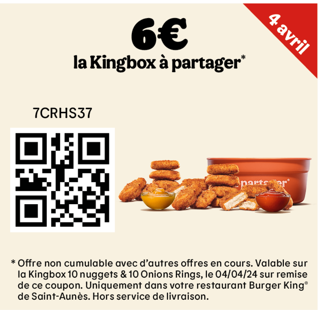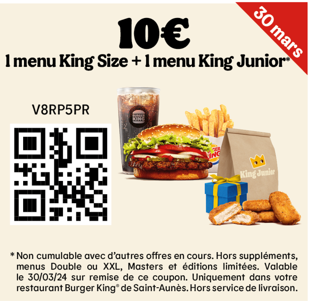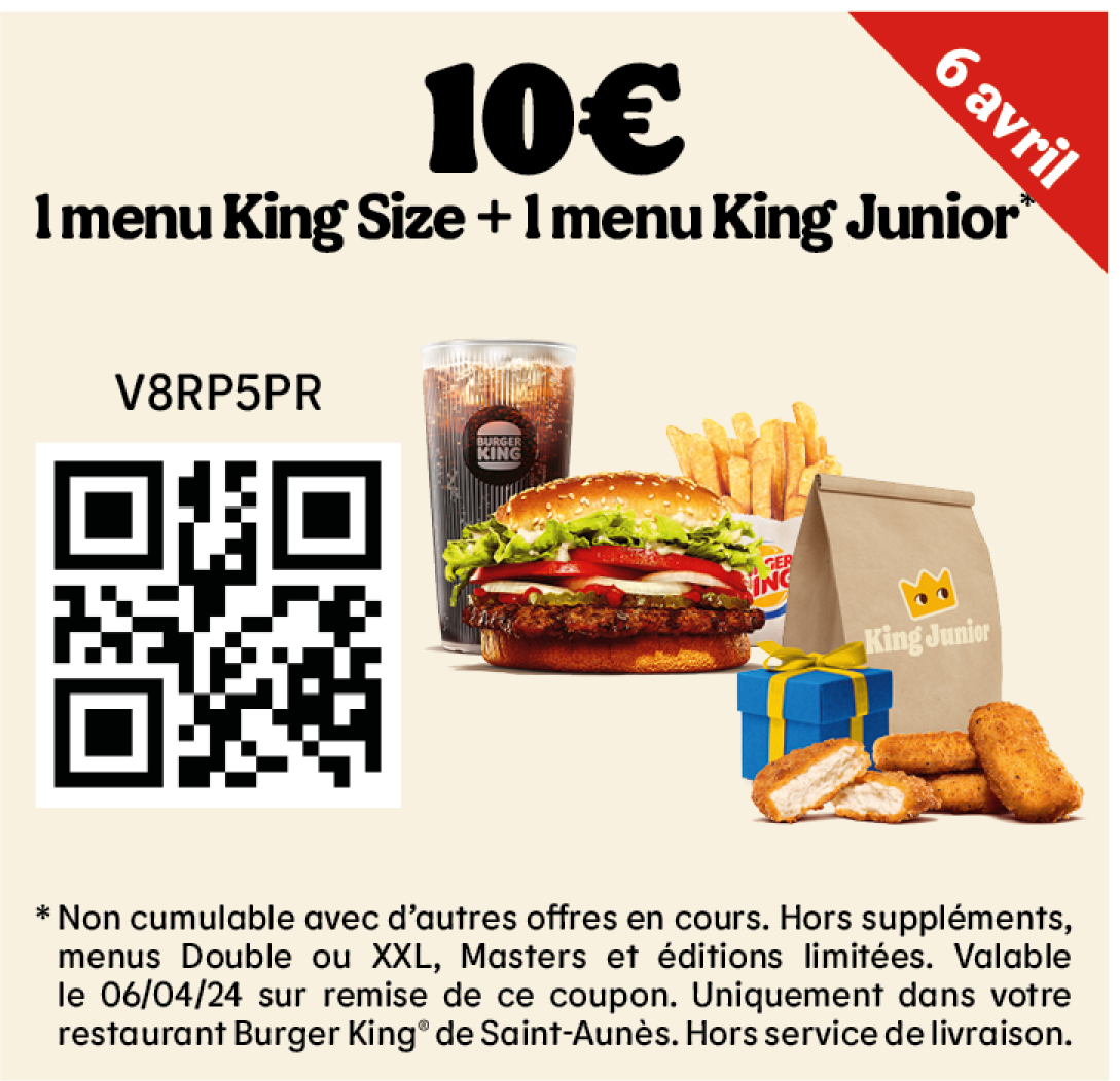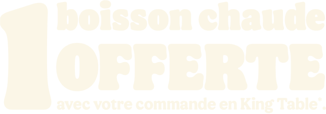* Un expresso, un café allongé ou un thé offert selon les disponibilités. Offre valable pour toute commande supérieure à 1€ en King Table. Offre non cumulable, valable uniquement dans les restaurants proposant le service de commande à table. Offre non disponible en borne, au Drive, en Click&Collect et en livraison.