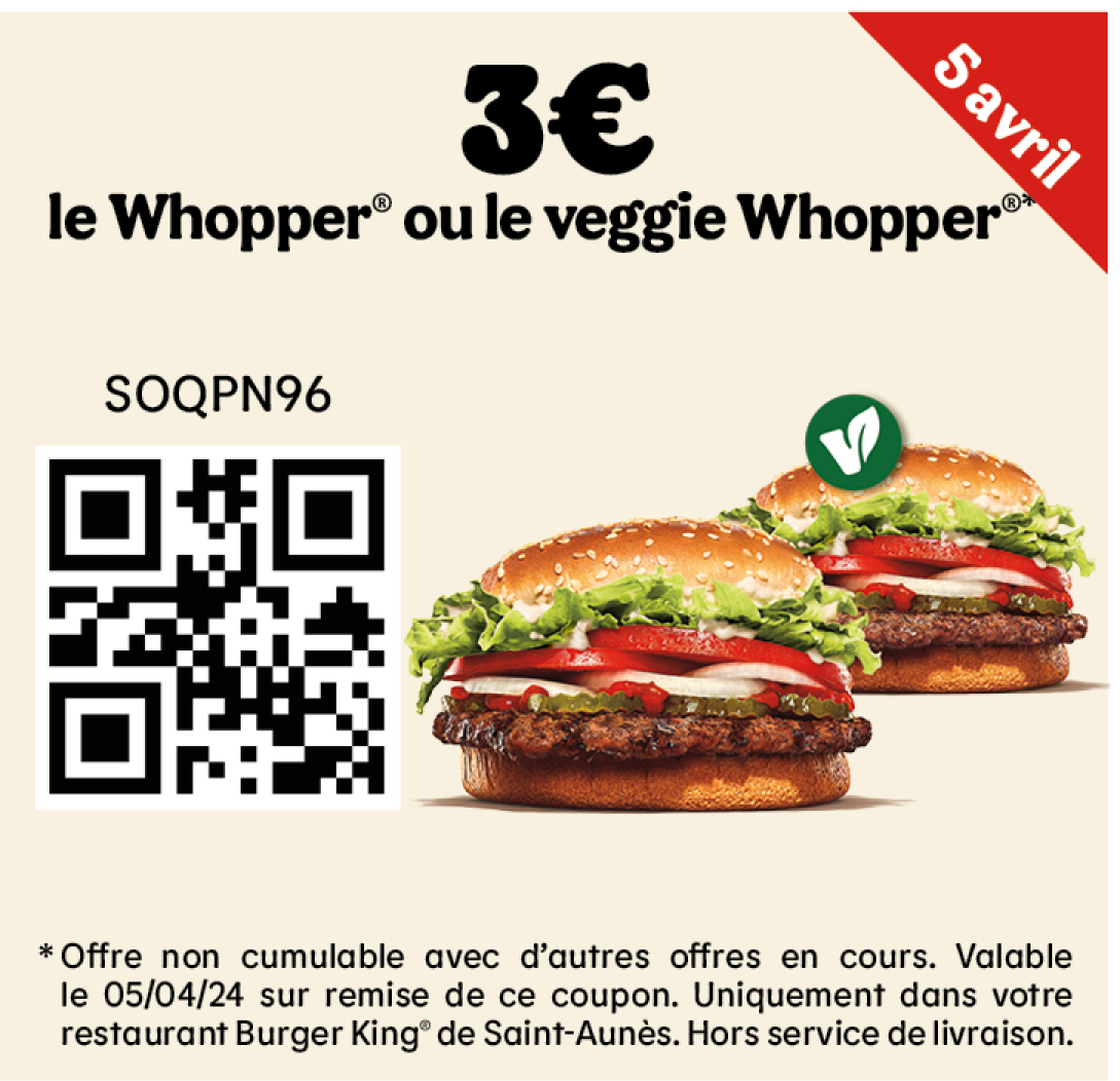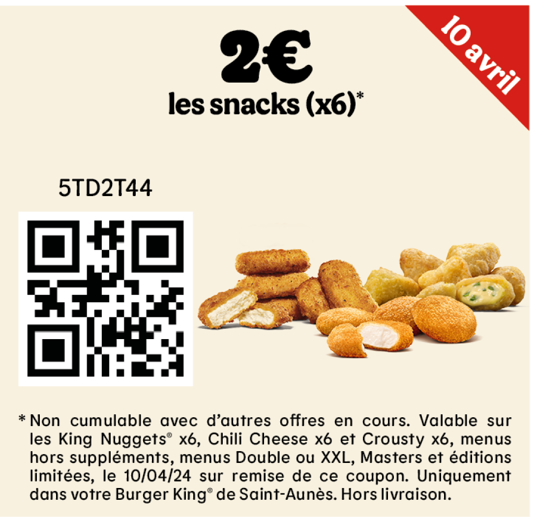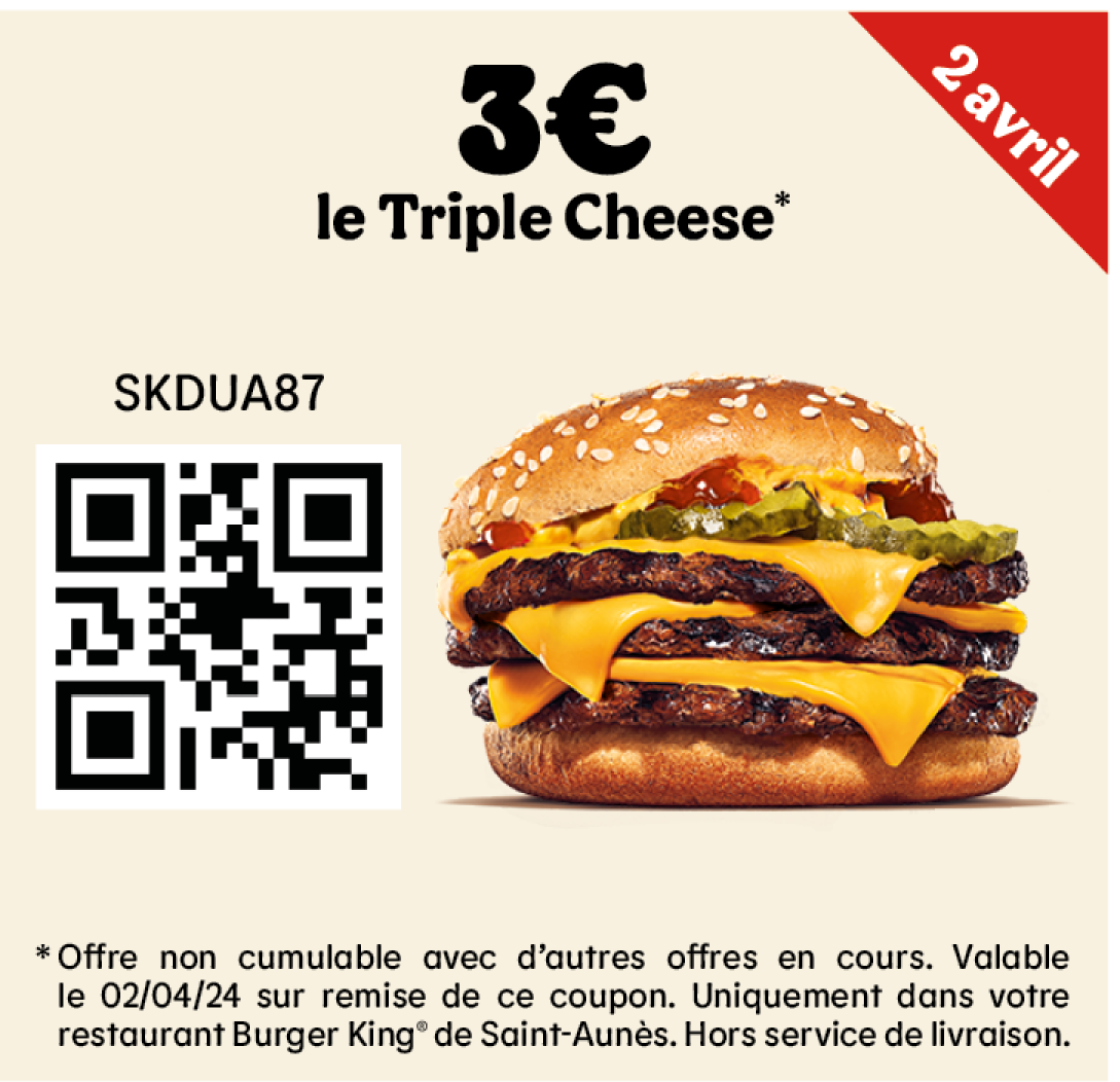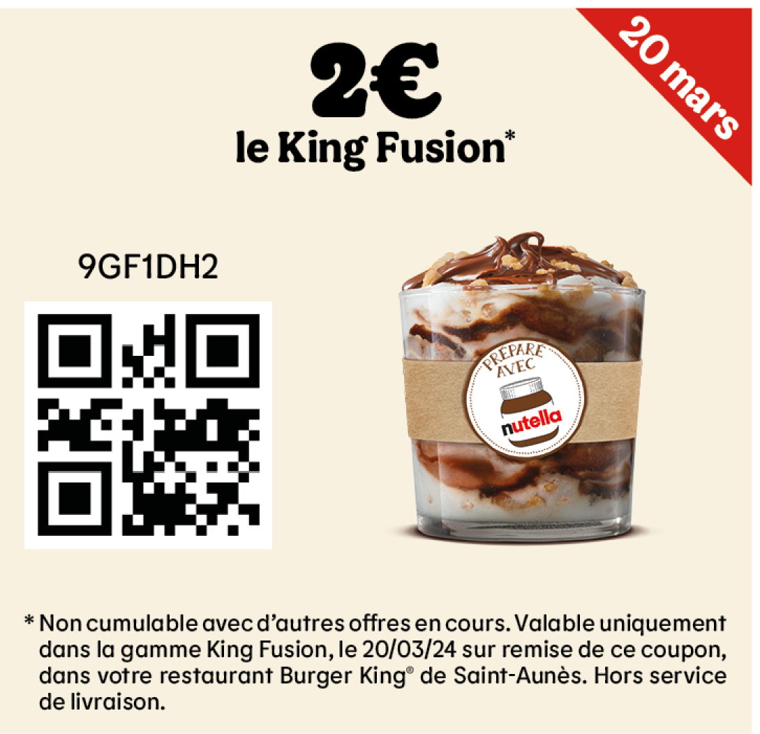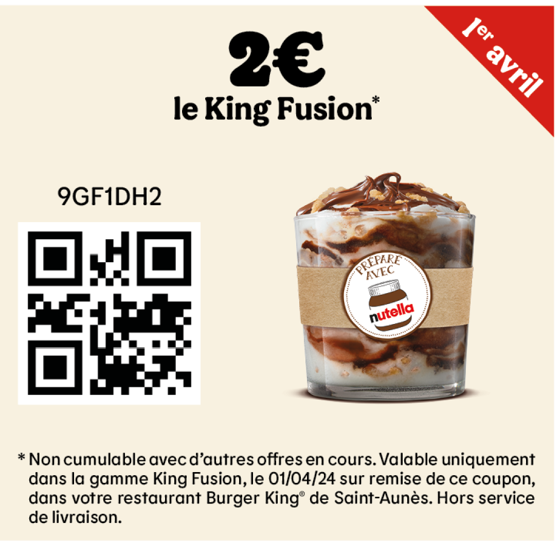 * Un expresso, un café allongé ou un thé offert selon les disponibilités. Offre valable pour toute commande supérieure à 1€ en King Table. Offre non cumulable, valable uniquement dans les restaurants proposant le service de commande à table. Offre non disponible en borne, au Drive, en Click&Collect et en livraison.