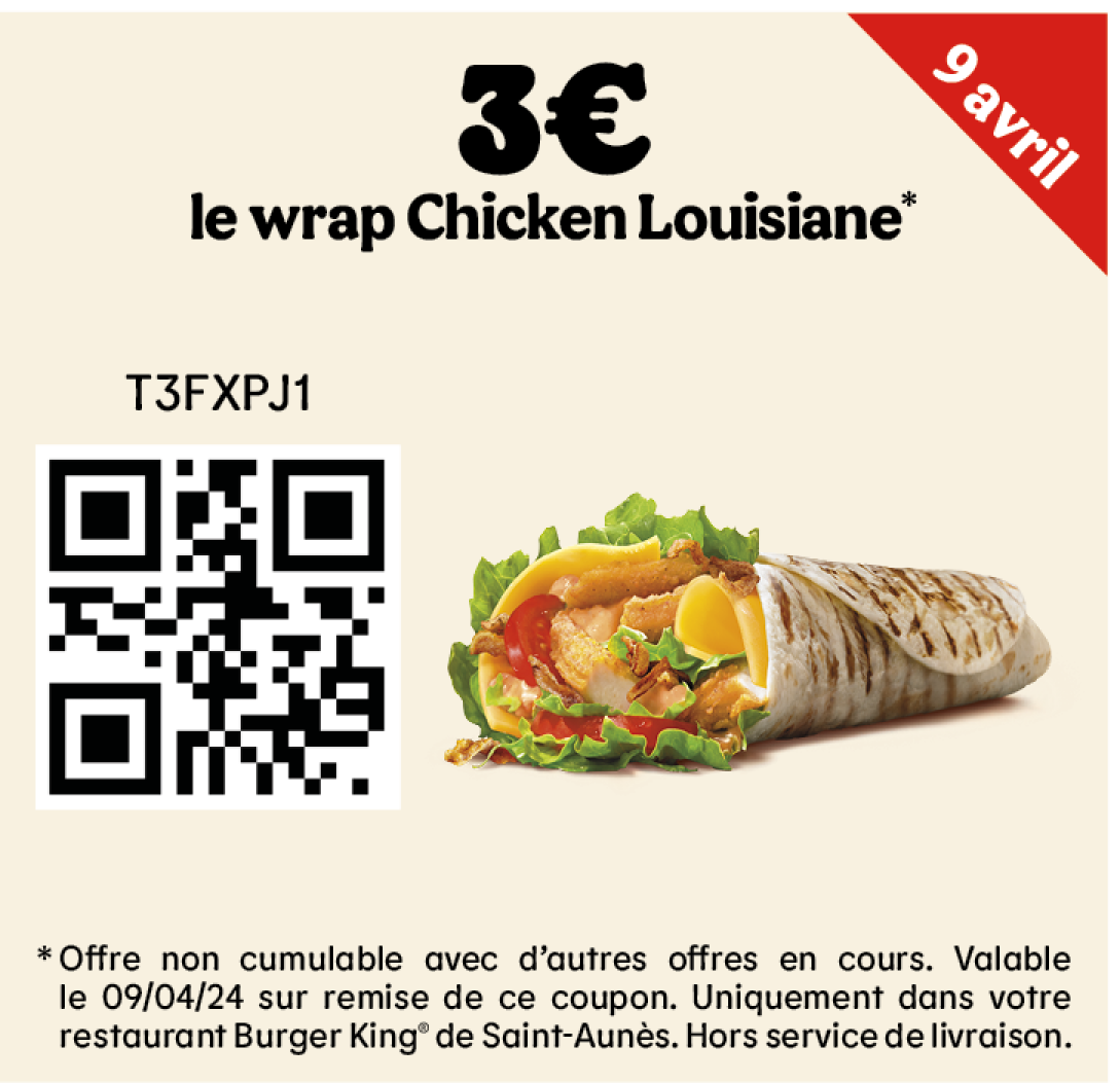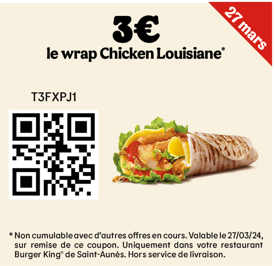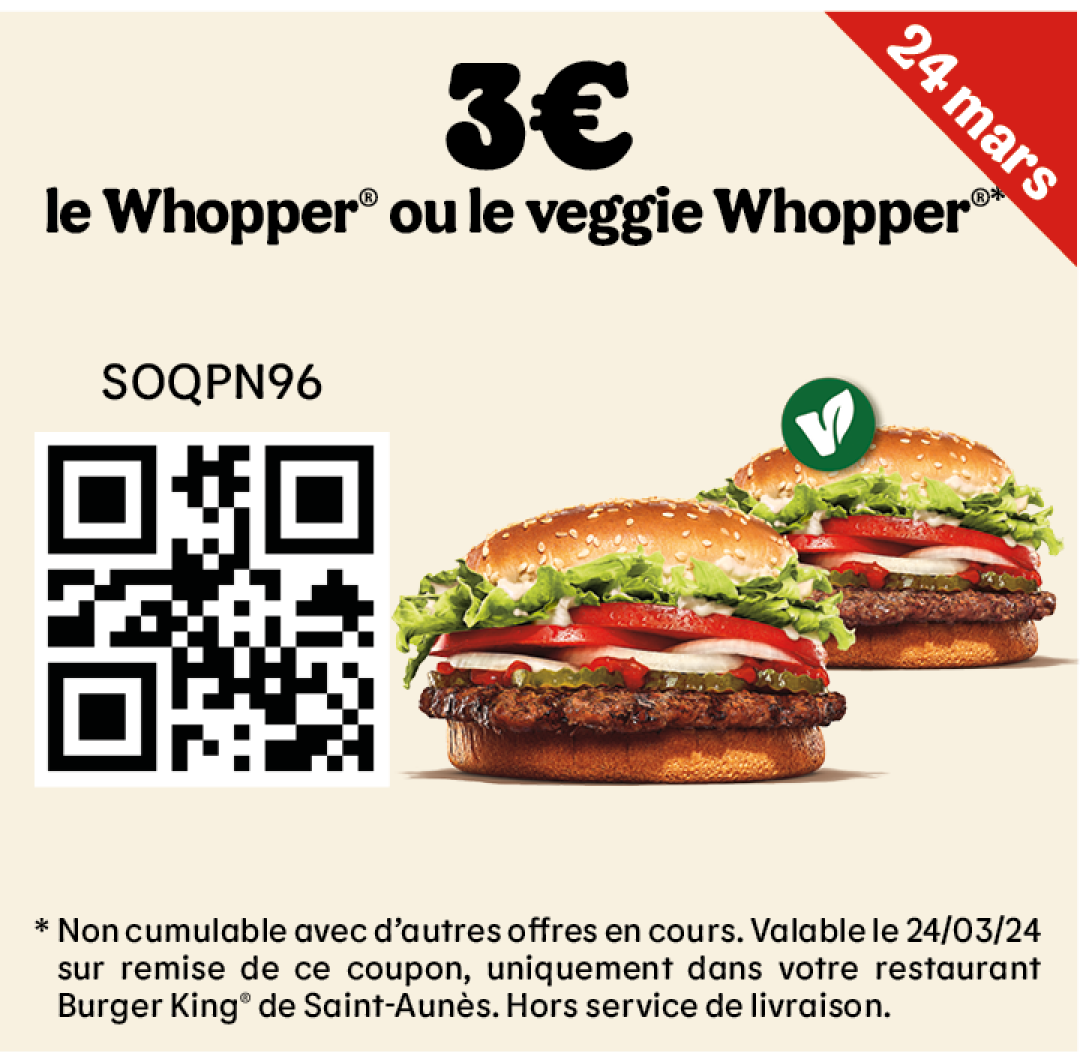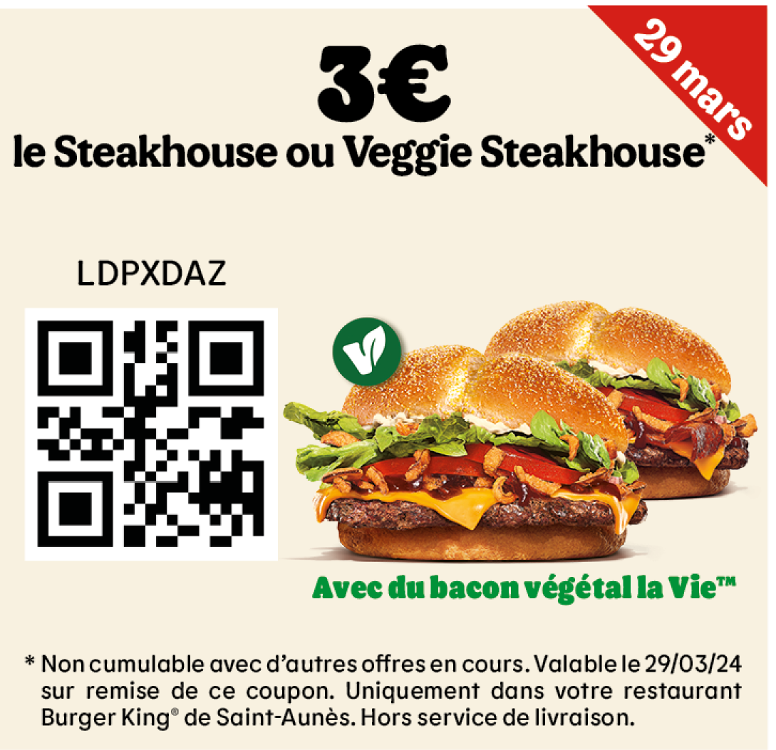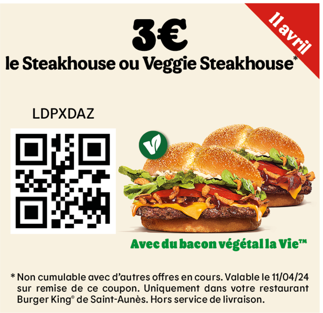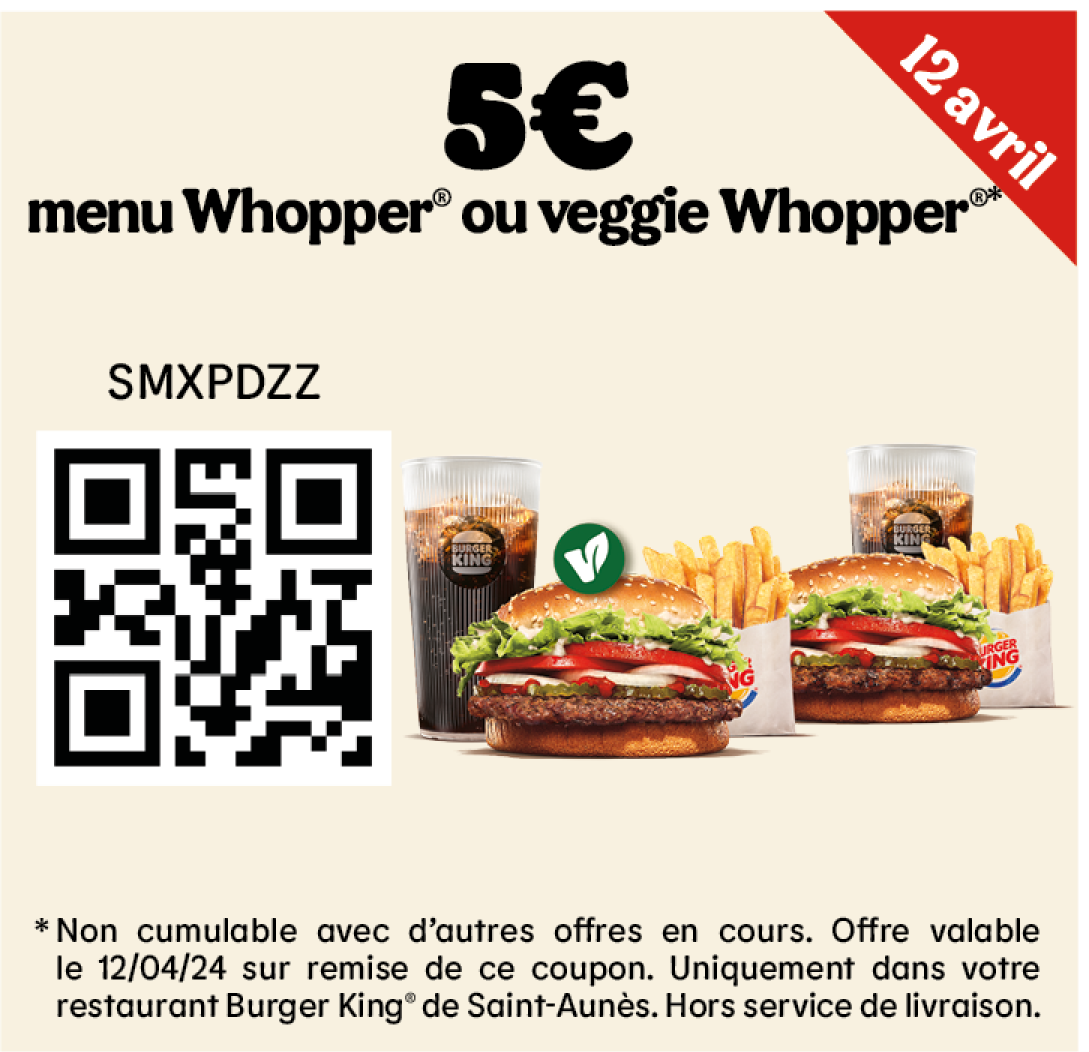 * Un expresso, un café allongé ou un thé offert selon les disponibilités. Offre valable pour toute commande supérieure à 1€ en King Table. Offre non cumulable, valable uniquement dans les restaurants proposant le service de commande à table. Offre non disponible en borne, au Drive, en Click&Collect et en livraison.